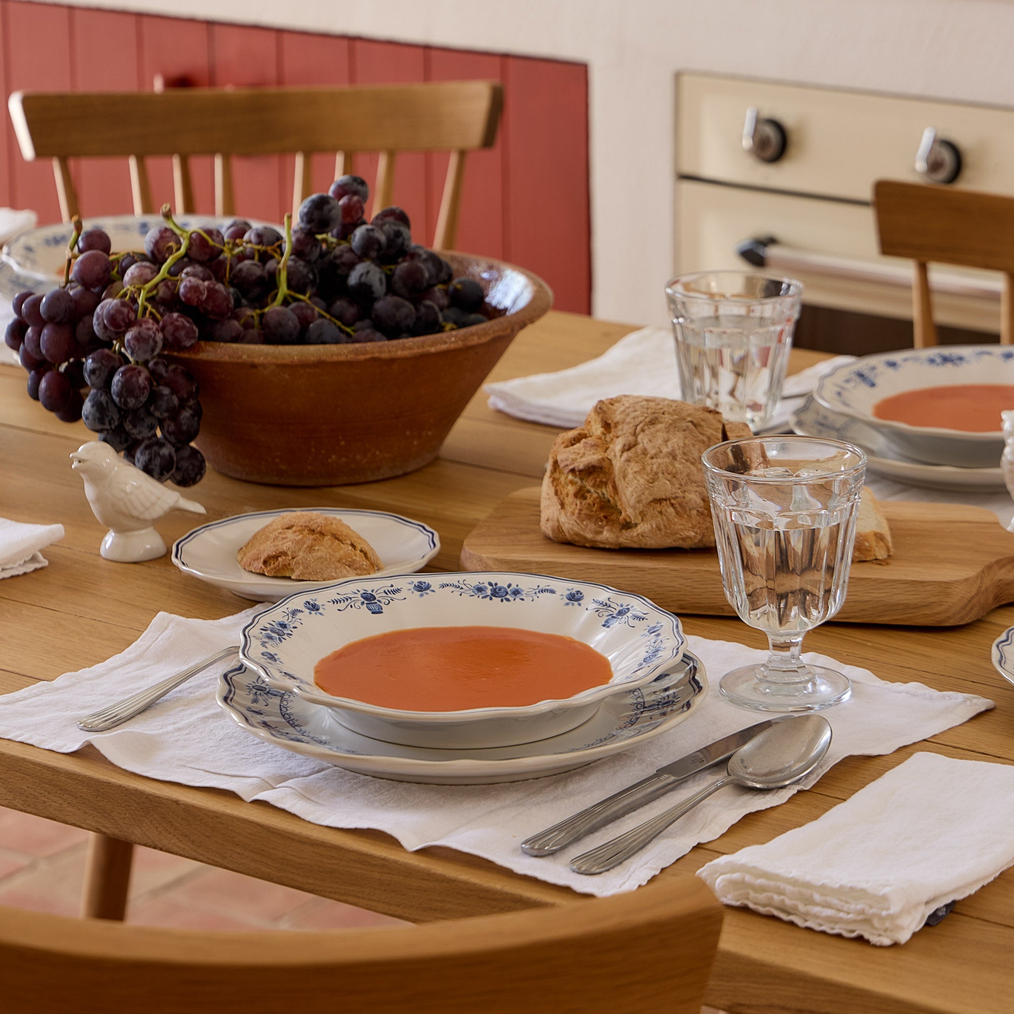 Dotée d’un émail brillant, la collection est disponible dans un mélange contemporain de cinq couleurs, ainsi que dans une version classique blanche avec filet bleu sur le bord, apportant une élégance intemporelle à la table.