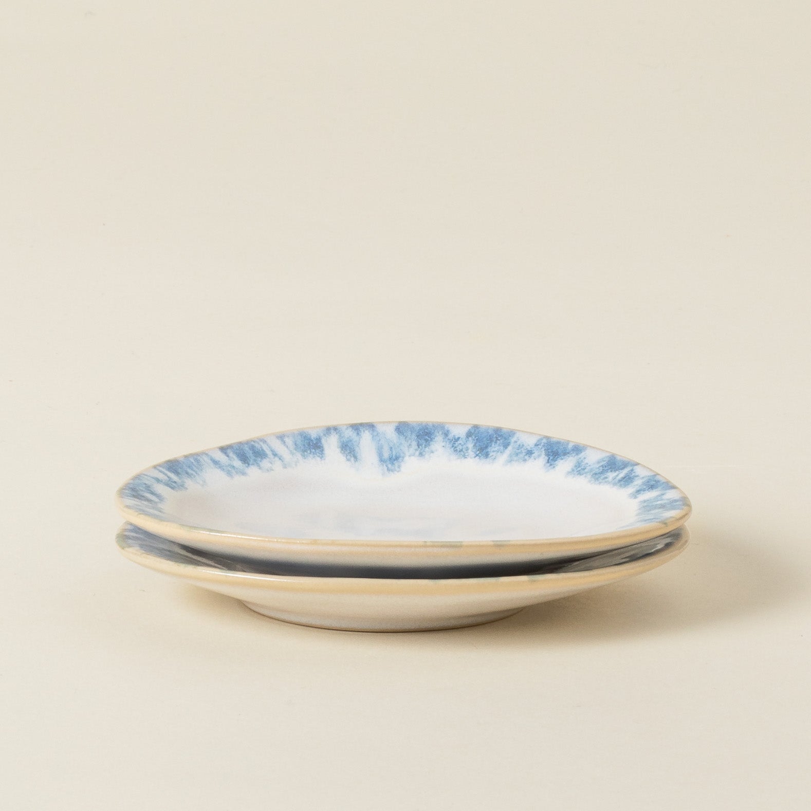 Présentant des formes organiques et un émail réactif dans des tons de blanc et de bleu, il s'écoule naturellement le long des côtés, créant une finition unique sur chaque pièce.