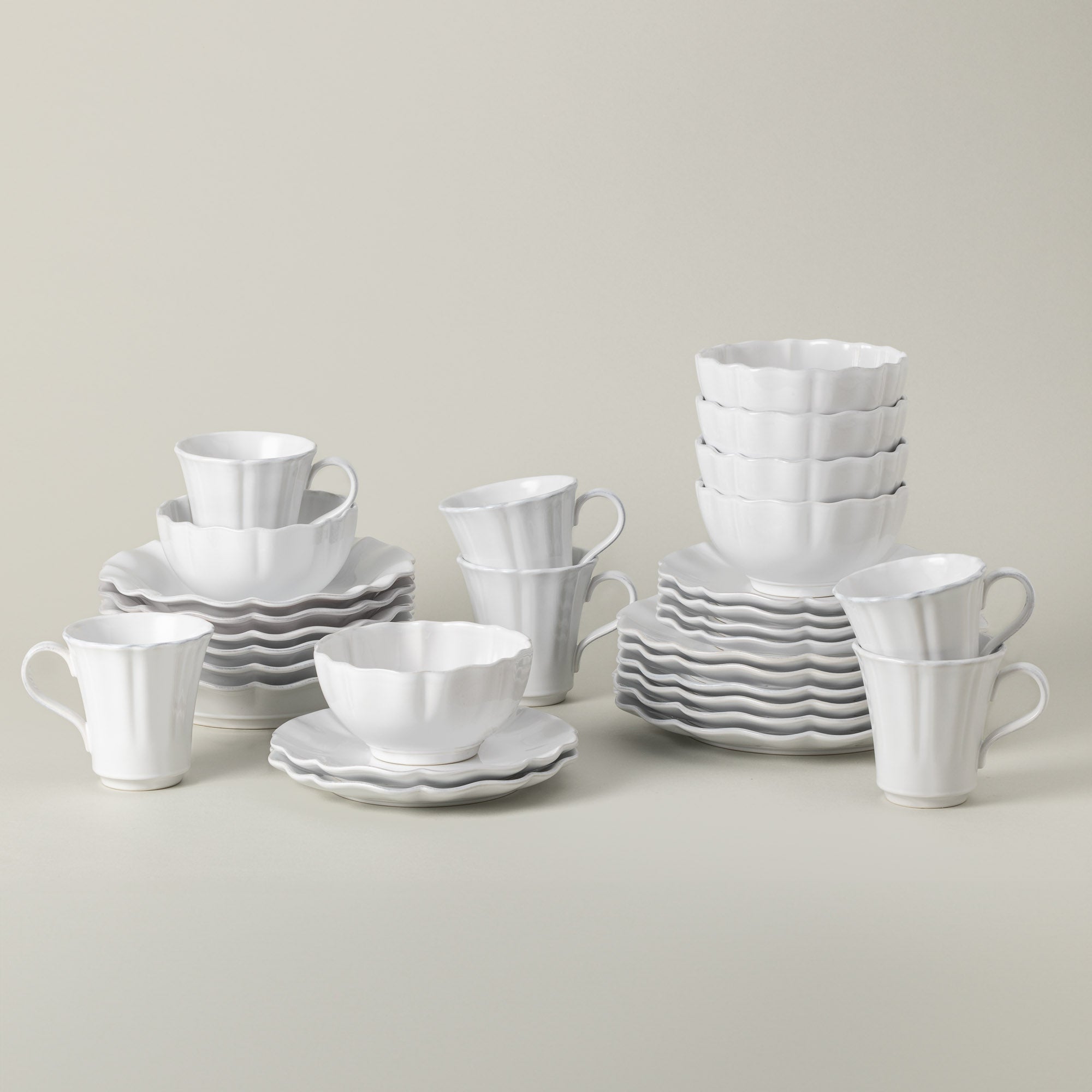 Le set comprend 6 assiettes à dîner, 6 bols à pâte, 6 assiettes à dessert, 6 bols à soupe/céréales et 6 mugs, idéal pour servir 6 personnes.