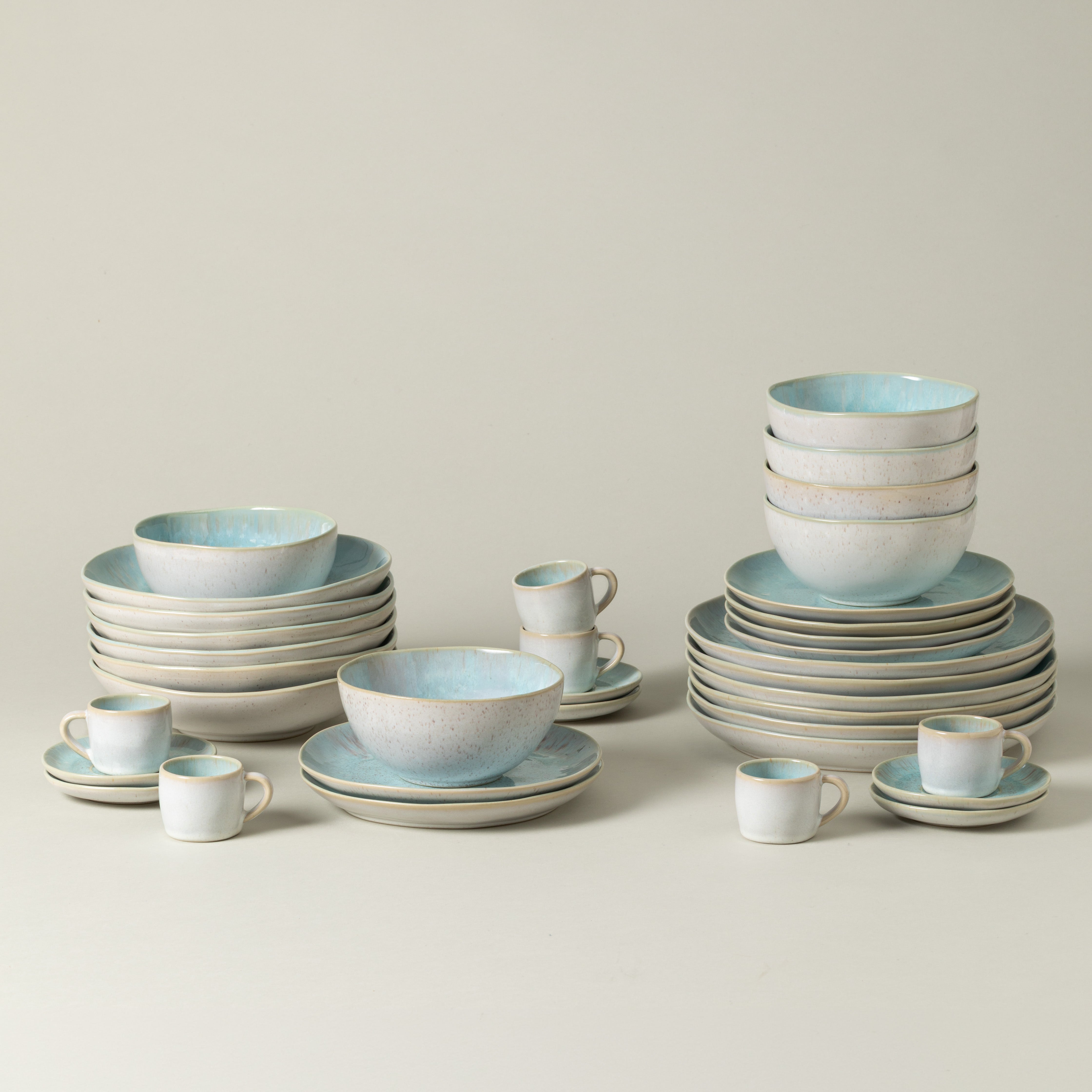 Disponível nas cores Sand Beige e Sea Blue, com rebordo creme, a coleção Eivissa inspira-se na beleza natural da ilha de Eivissa. A coleção inclui peças como pratos, taças, canecas, saladeiras, açucareiros, travessas, assadeiras e conjuntos de mesa em diversos sets, perfeitas para momentos casuais ou jantares especiais.
