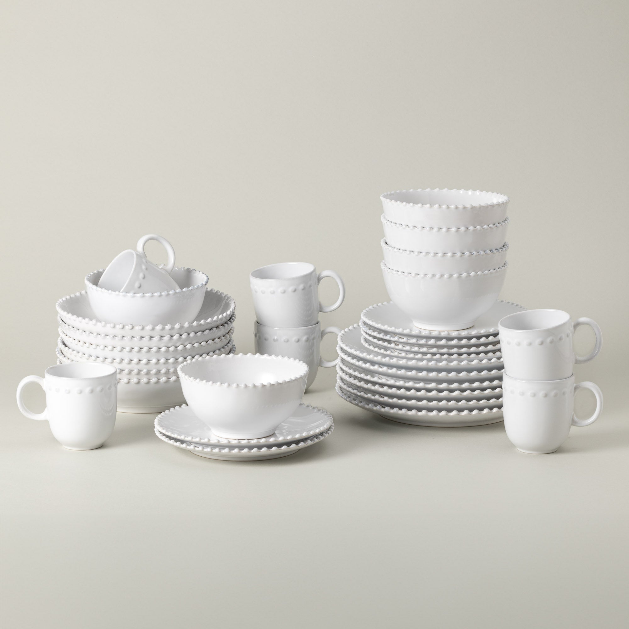 Inspirada nas cerâmicas europeias dos séculos XVIII e XIX, a coleção Pearl reflete a elegância e o requinte dessas épocas, reinterpretando-as com um toque contemporâneo. O detalhe das pérolas grandes no rebordo, acabadas à mão, é o que torna cada peça única e distinta. Este elemento decorativo, aliado ao vidrado branco brilhante, cria um equilíbrio perfeito entre tradição e modernidade.