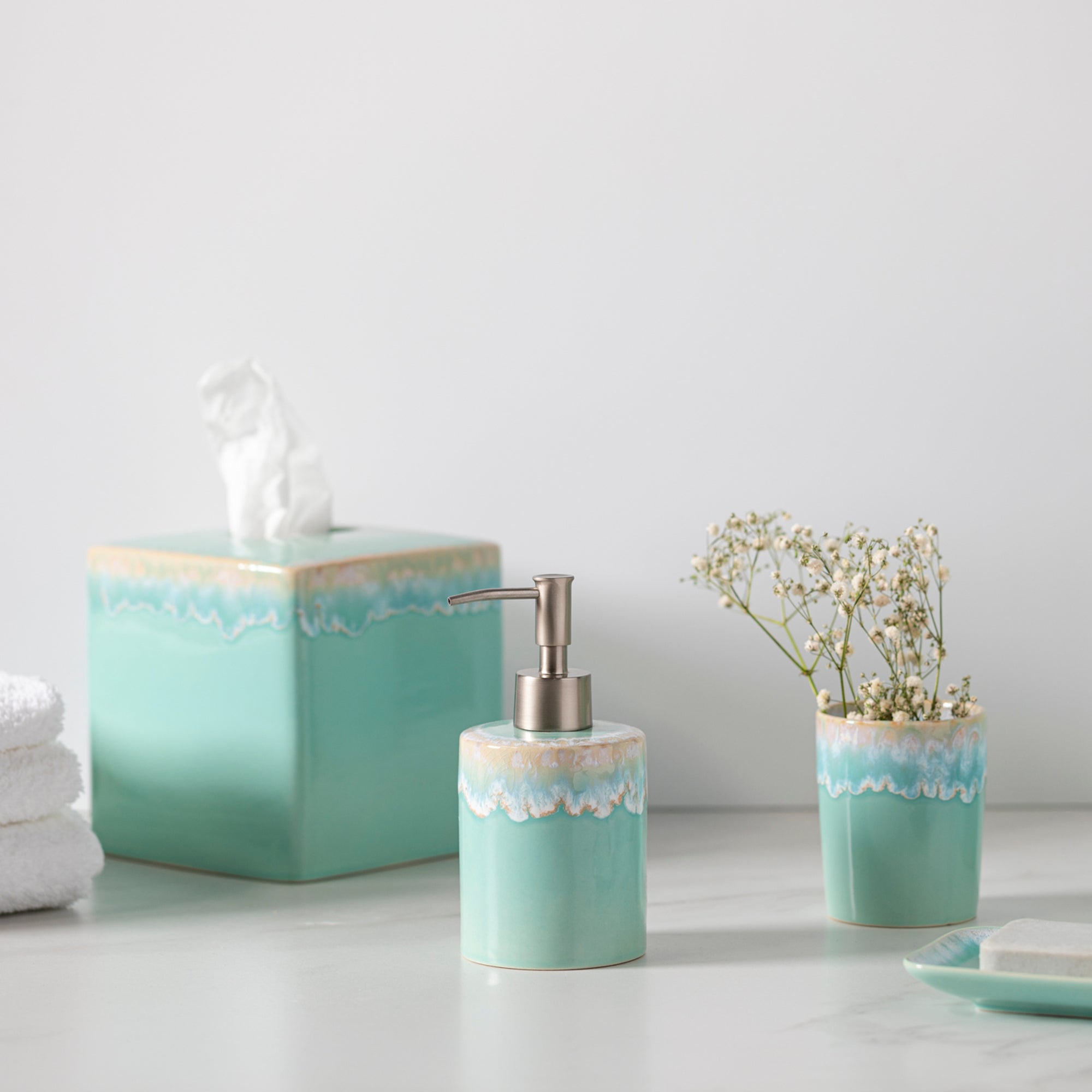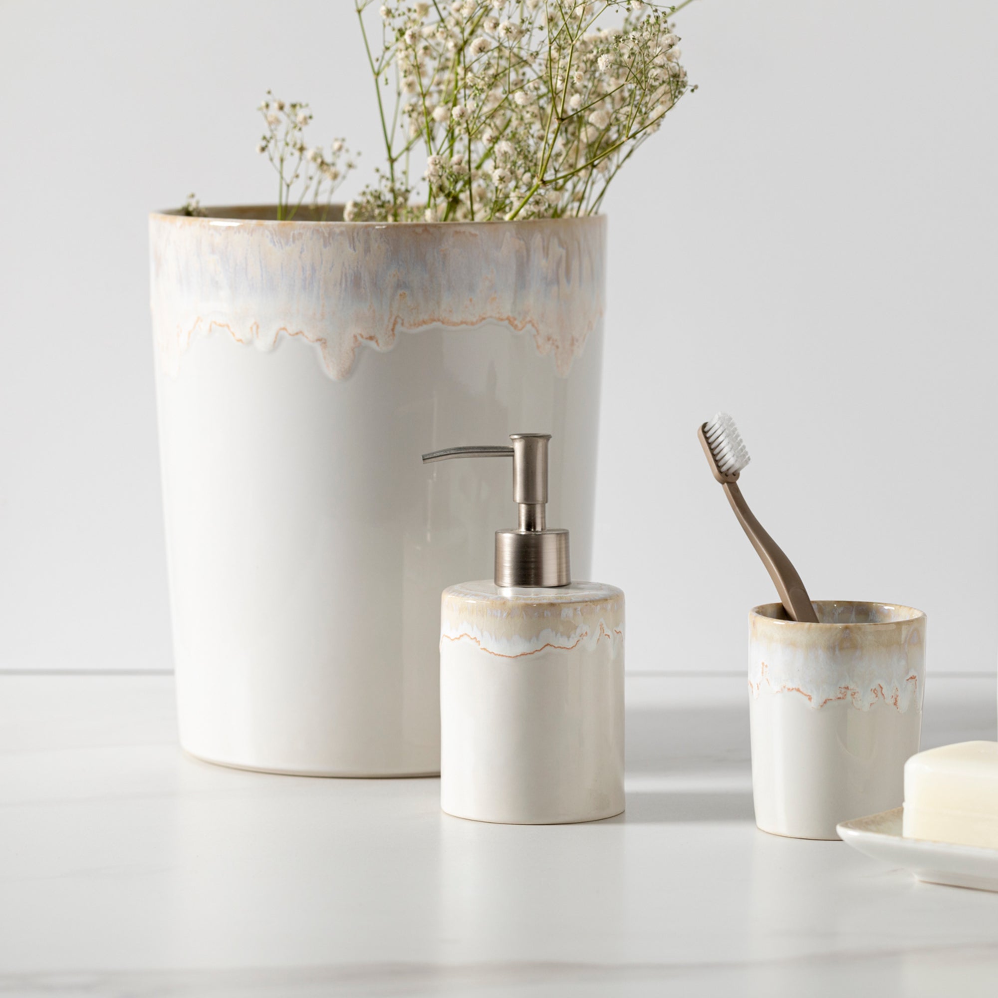 Elevate your bathroom’s aesthetic with our exquisite collection of fine stoneware bathroom accessories.